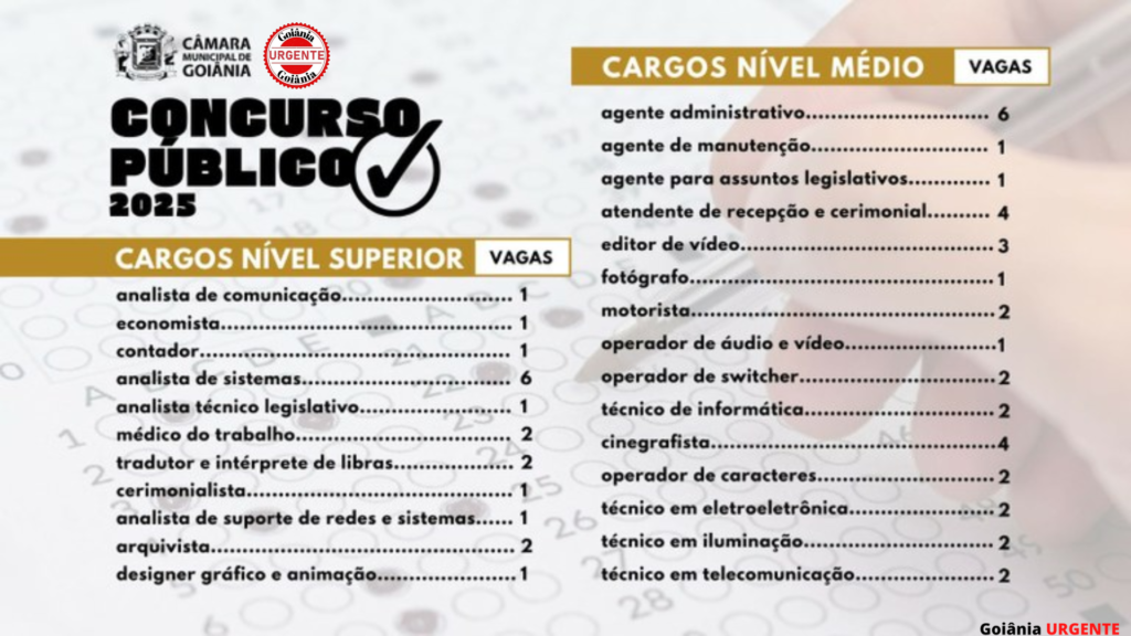 A Câmara Municipal de Goiânia publicou nesta semana uma retificação no edital de seu próximo concurso público, promovendo ajustes significativos nos requisitos e conteúdos programáticos para cargos de nível superior e técnico. As alterações atingem principalmente os postos de Médico do Trabalho e Tradutor e Intérprete de Libras, além de atualizar disciplinas voltadas a candidatos de nível médio e técnico.