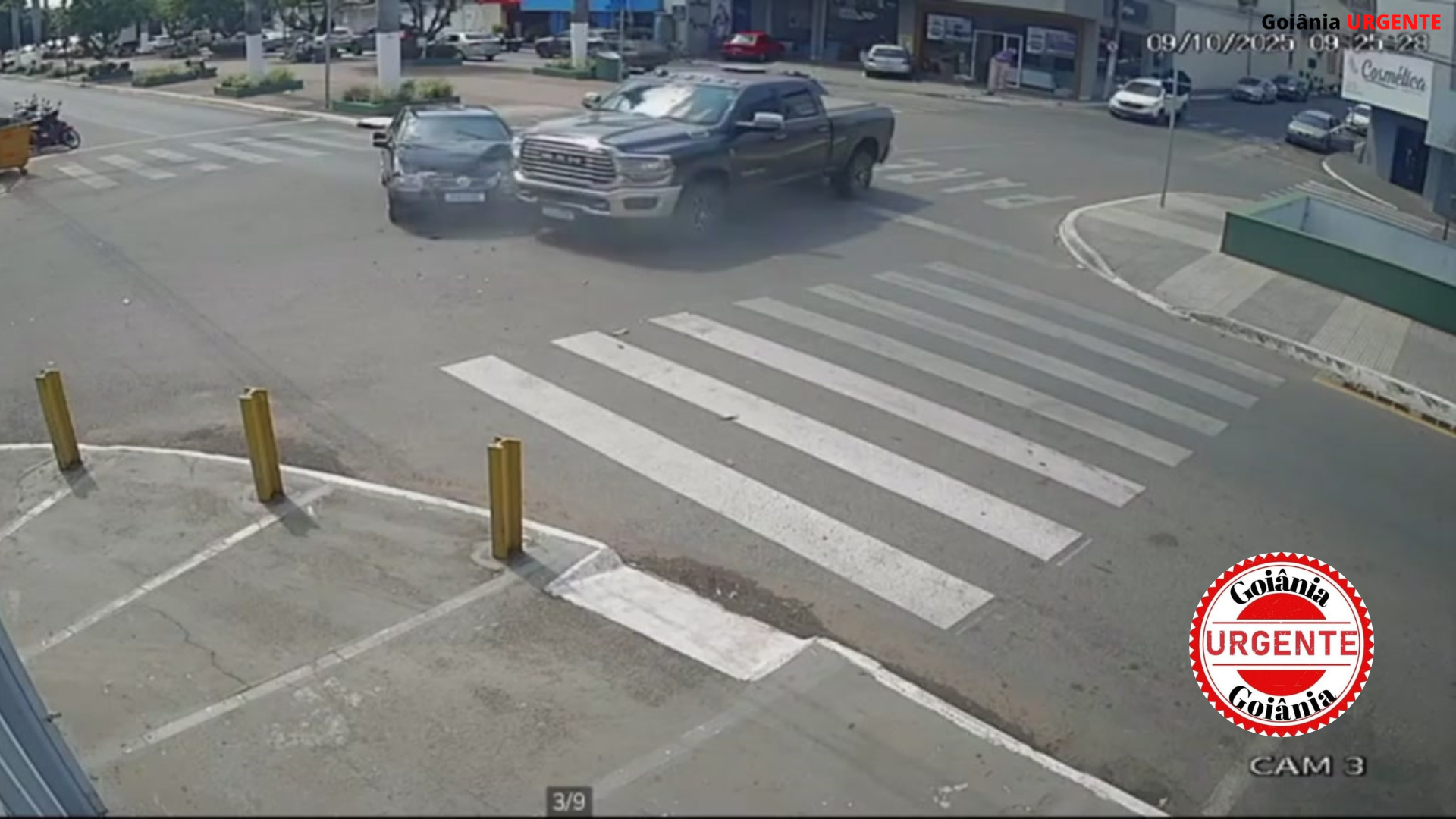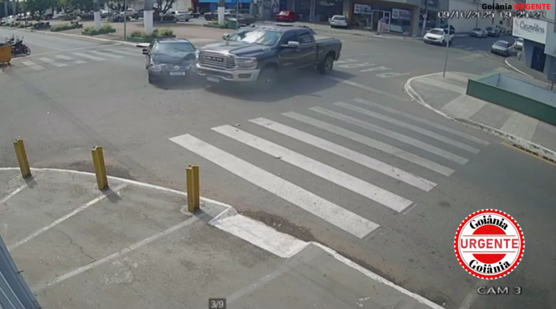 Câmeras flagram colisão entre caminhonete e carro em cruzamento movimentado no centro de Catalão.
