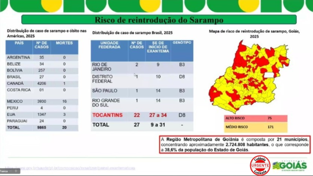 Segundo a superintendente de Vigilância Epidemiológica e Imunização da SES-GO, Cristina Laval, o Brasil já contabiliza 27 casos confirmados de sarampo em 2025, dos quais 22 estão no estado vizinho do Tocantins, em situação de surto ativo. Embora Goiás ainda não registre casos neste ano, a baixa cobertura vacinal coloca 75 municípios em risco alto para a reintrodução da doença, atingindo diretamente uma população superior a 2,7 milhões de pessoas, sobretudo na região metropolitana de Goiânia. Outras 171 cidades estão classificadas com risco médio.
