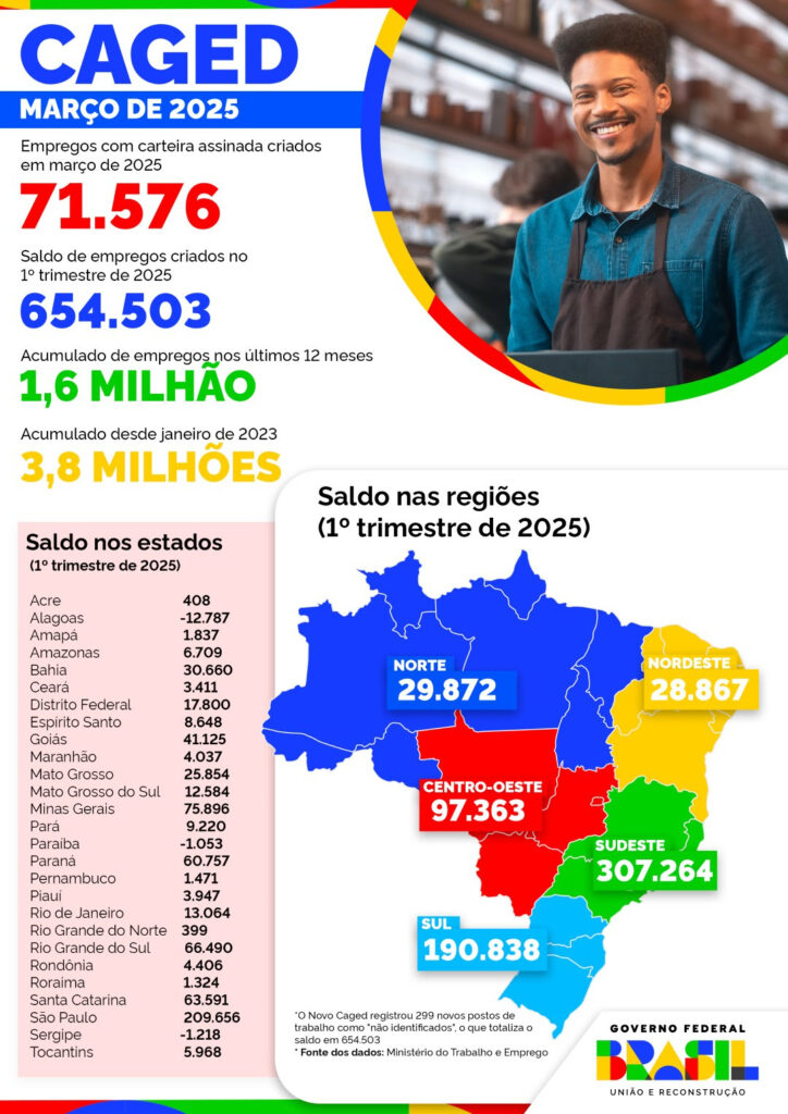 Em âmbito nacional, o Brasil criou 71.500 vagas com carteira assinada em março e 654,5 mil no acumulado de janeiro a março de 2025, alcançando o maior nível de emprego formal da história: 47,857 milhões de trabalhadores registrados. Desde o início do atual governo federal, em janeiro de 2023, o saldo positivo já ultrapassa 3,79 milhões de postos formais.