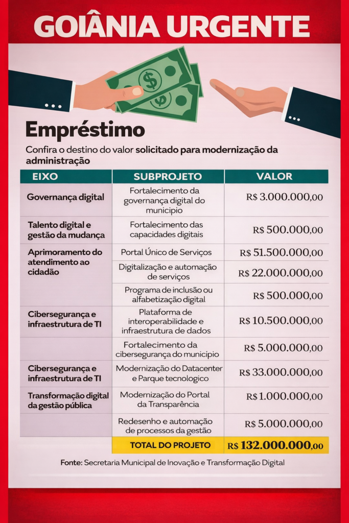 A Prefeitura de Goiânia avança nas articulações políticas para contratar um empréstimo de R$ 132 milhões junto ao BNDES, com a justificativa de promover uma ampla transformação digital da administração municipal, incluindo a integração de sistemas, a digitalização de serviços e a implantação de soluções de inteligência artificial no atendimento ao cidadão. O plano, defendido pela gestão do prefeito Sandro Mabel (União Brasil), está em análise na Câmara Municipal e tem gerado questionamentos técnicos e fiscais sobre escopo, custos e efetividade.