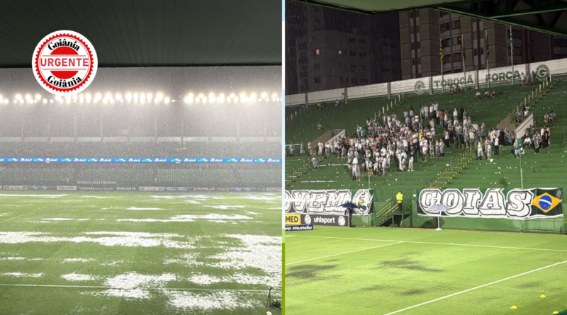 Chuva intensa comprometeu as condições do gramado e levou à paralisação da partida após o primeiro tempo, com vitória parcial do Goiás; confronto será retomado nesta quinta-feira