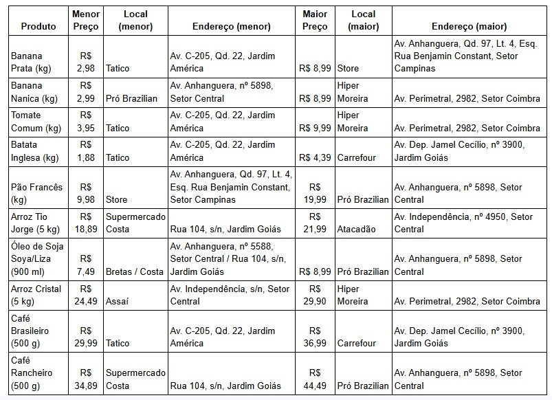 O levantamento, realizado em nove estabelecimentos comerciais da cidade, identificou itens com oscilações expressivas: